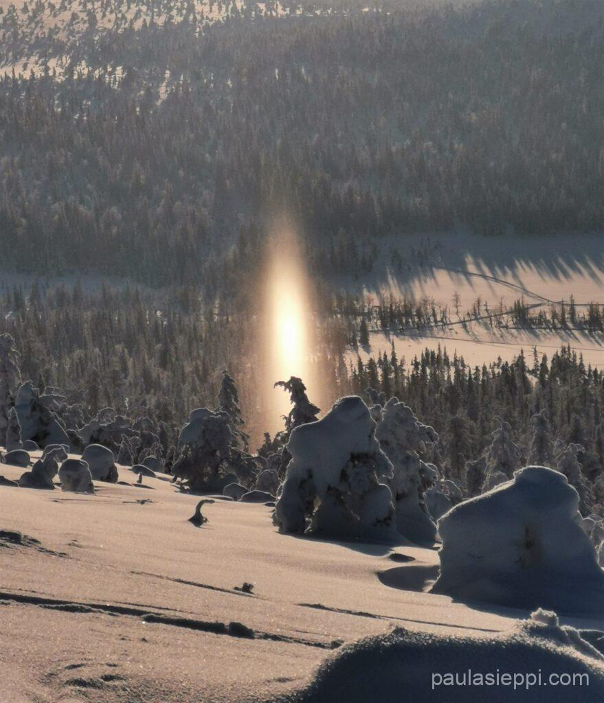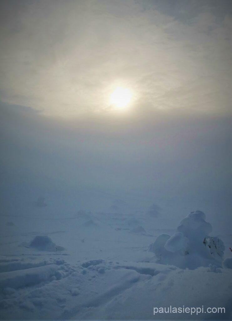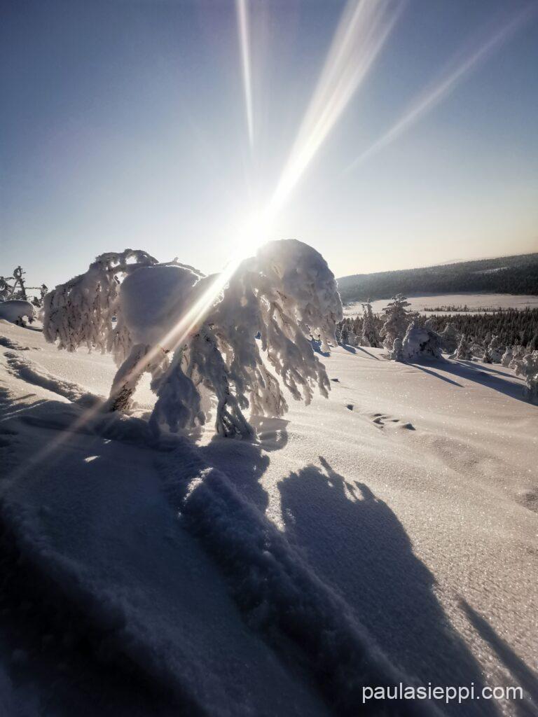 Mutta mutta… niin hoppu sole koskhaan, ettei kerkiäis tunturille. Tekkee hyvvää hengitellä kaikessa rauhassa, ei kethään mishään, omat jäljet vain hangela. Aina välilä häätyy pittää hengähystauko.