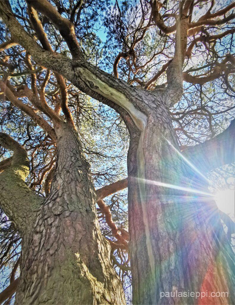 Mänty ei ollut kovin korkea, mutta sen muoto oli ihastuttava. Oksisto kaartui täydellisen tasaisena ja säännönmukaisena sateenvarjona suunnattoman paksun rungon yllä. Mäntyvanhusta oli selvästi elämä koetellut, sen runko oli haaronut jo melko alhaalta ja sen oksissa oli isoja haavoja, joita puu oli kylestänyt umpeen. Rungon ympärysmitta on komeat 548 senttiä. Ja nuo oksat, voi ne olivat mutkikkaita taideveistoksia kaikki! Kovan elämän känkkyräisiä mutkia koko suuri latvus tulvillaan. Valo siilautui oksien lomasta kilpikaarnaiselle rungolle ja läikkyi siinä kuin esitellen ikivanhan rungon hienostuneen lämmintä väriskaalaa. Mikä tämän puun tarina oli, miksi se oli rauhoitettu ja kuuluisa? No miepä kerron.