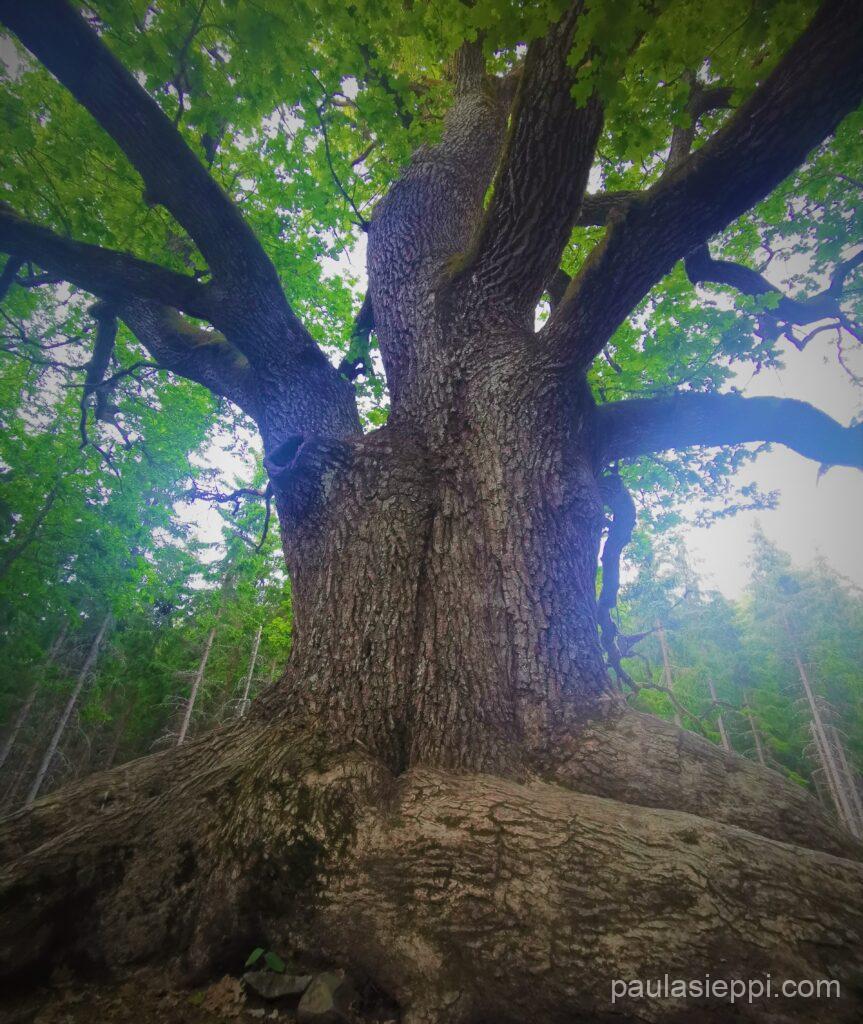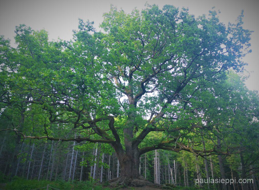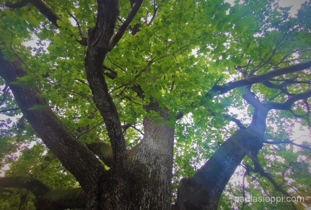 Ajelin mietteissäni kohti Lohjaa katsomaan toista ihmeellistä Maaäidin luomusta ja saavuin illansuussa perille. Paavolan tammelle johtaa parkkipaikalta lyhyt ja soma luontopolku. Kielot tuoksuivat kesäillan hämyssä ja olin ihastuksissani hiljaisuudesta, ketään muuta ei ollut liikkeellä, sain astella vihreänä kaartuvan lehdon polulla kaikessa rauhassa. Tiesin Paavolan tammen olevan niin vetovoimainen, että sen juurella käy jatkuva ihmisvilinä. Ikioma hiljentymisen hetki sen tyvellä olisi harvinainen herkku, josta sain olla kiitollinen.
